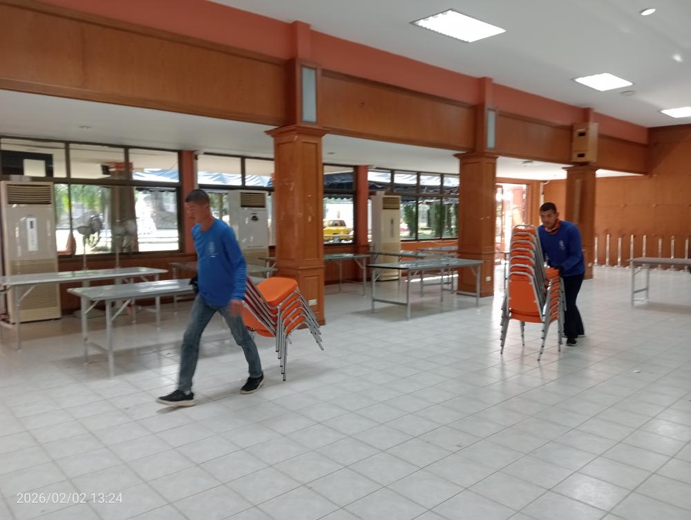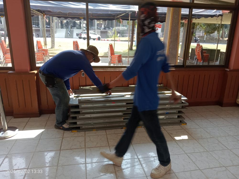 เก็บโต๊ะเก้าอี้หลังเสร็จสิ้นงานการเลือกตั้งล่วงหน้าณหอประชุมกาสะลองคำ