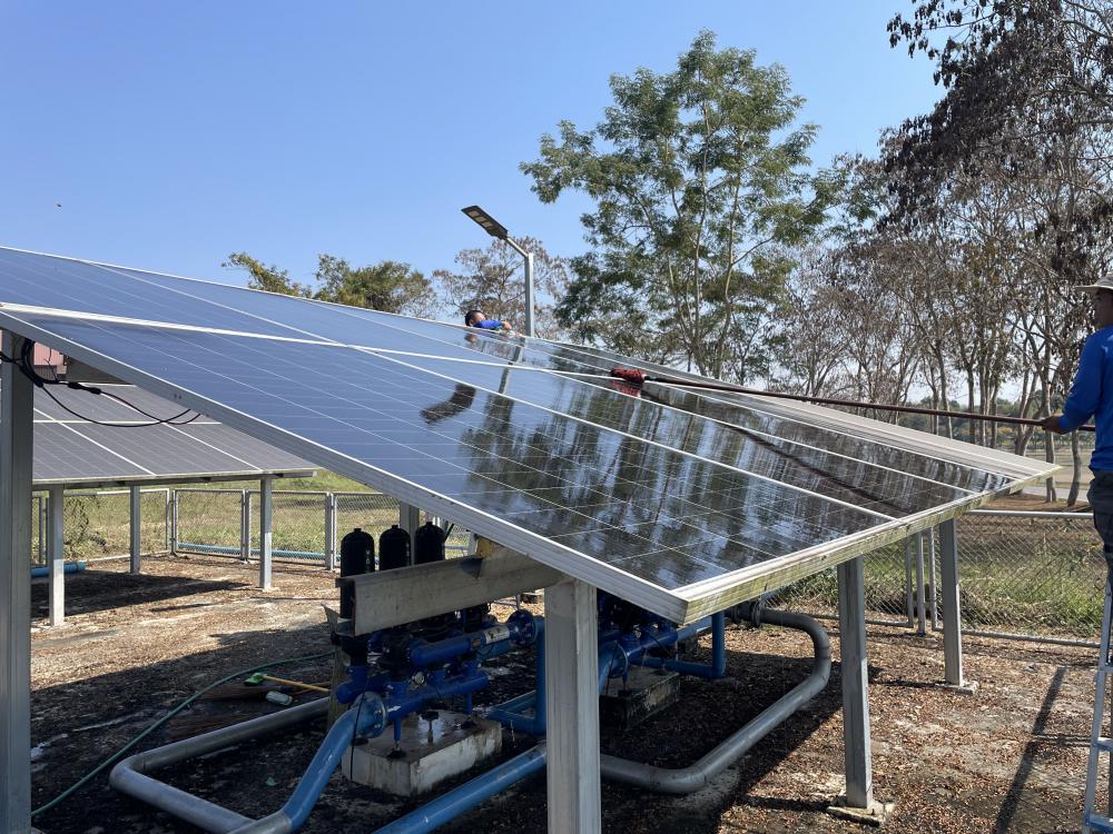 กองบริหารกายภาพฯ กำจัดวัชพืชภายในและบริเวณโดยรอบ ล้างทำความสะอาดแผงโซล่าเซลบริเวณปั้มน้ำพลังงานแสงอาทิตย์ประตู 3