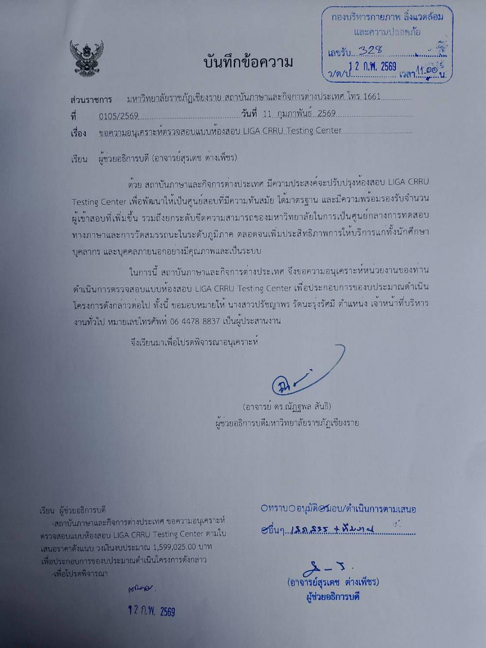 สถาบันภาษาฯ ตรวจสอบแบบปรับปรุงห้องสอบ LIGA CRRU Testing Center อาคารสถาบันภาษาและกิจการต่างประเทศ ตามใจเสนอราคา วงเงินงบประมาณ 1,599,025 บาท