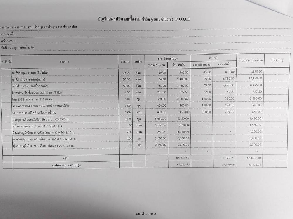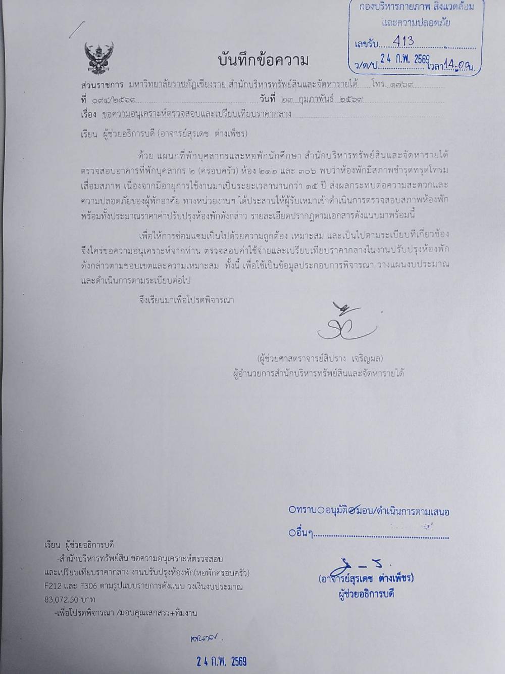 สำนักบริหารทรัพย์สินฯ ตรวจสอบและประมาณราคาซ่อมแซม ห้อง 212 และ 306 อาคารที่พักบุคลากร 2 (ครอบครัว) งบประมาณ 83,072.50