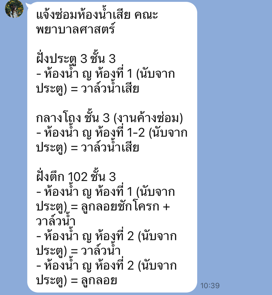 คณะพยาบาลศาสตร์ ฝั่งประตู 3 ชั้น 3 - ห้องน้ำ ญ ห้องที่ 1 (นับจากประตู) = วาล์วน้ำเสีย ฝั่งตึก 102 ชั้น 3 - ห้องน้ำ ญ ห้องที่ 1 (นับจากประตู) = ลูกลอยชักโครก + วาล์วน้ำ - ห้องน้ำ ญ ห้องที่ 2 (นับจากประตู) = วาล์วน้ำ - ห้องน้ำ ญ ห้องที่ 2 (นับจากประตู) = ลูกลอย