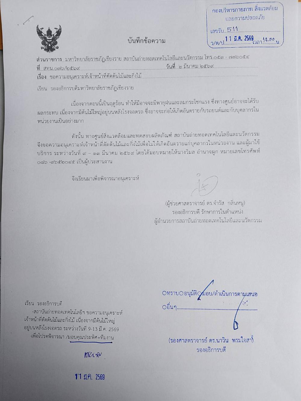 สถาบันถ่ายทอดเทคโนโลยีนวัตกรรม ตัดต้นไม้และกิ่งไม้บริเวณหลังโรงจอดรถ ศูนย์สิ่งแวดล้อมและทดสอบผลิตภัณฑ์