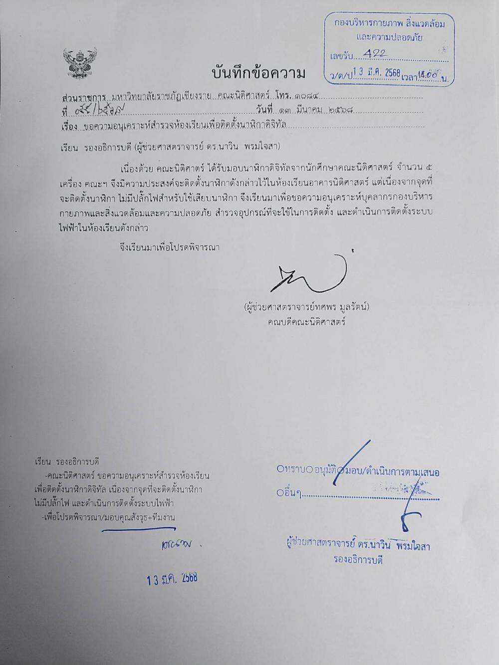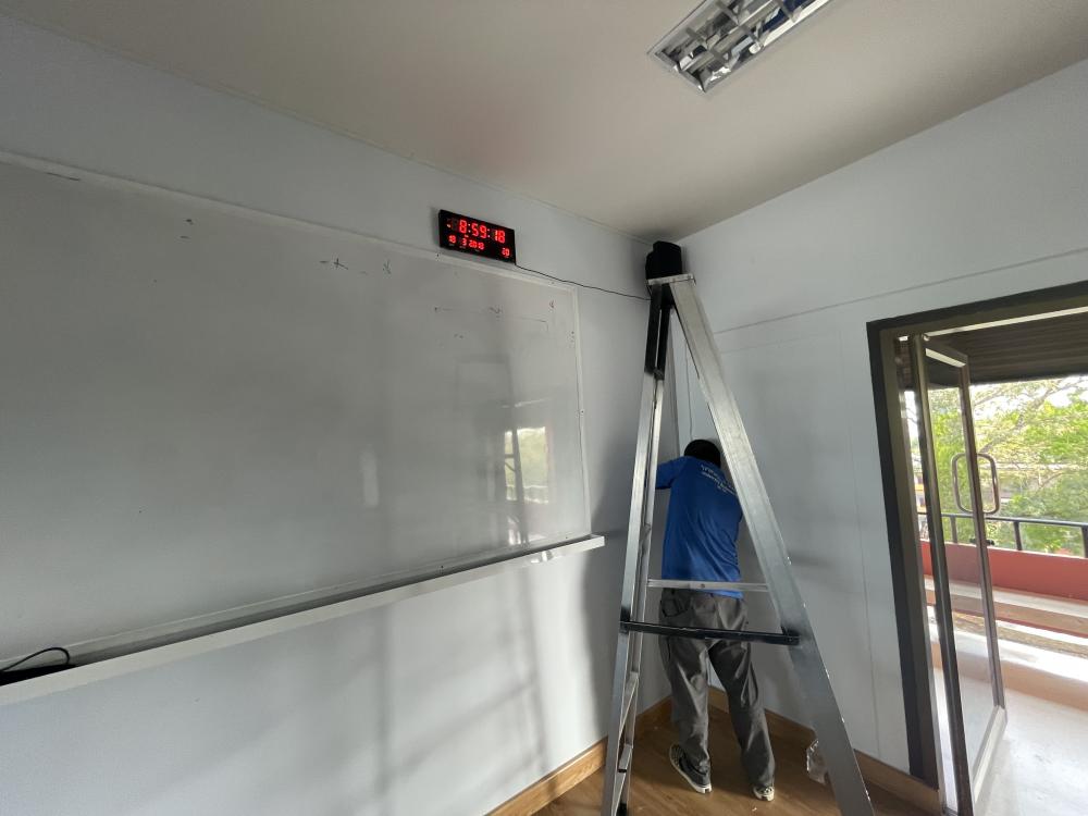 สำรวจจุดติดตั้งปลั๊กไฟเพิ่มเติมภายในคณะนิติศาสตร์ สำหรับนาฬิกาดิจิทัล จำนวน 5 จุด