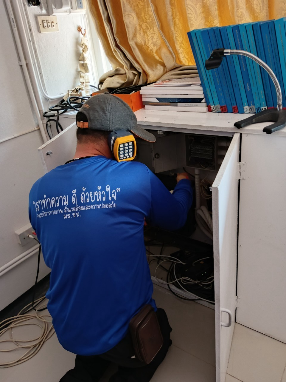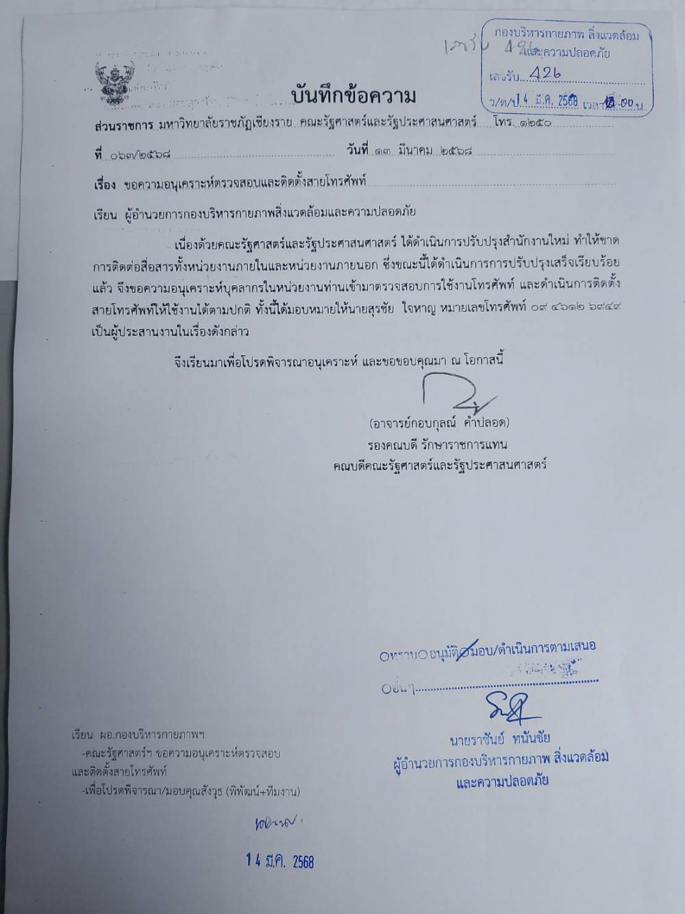 คณะรัฐศาสตร์ฯ ตรวจสอบและติดตั้งระบบโทรศัพท์ภายในอาคารคณะรัฐศาสตร์ฯ เนื่องจากปรับปรุงสำนักงานใหม้
