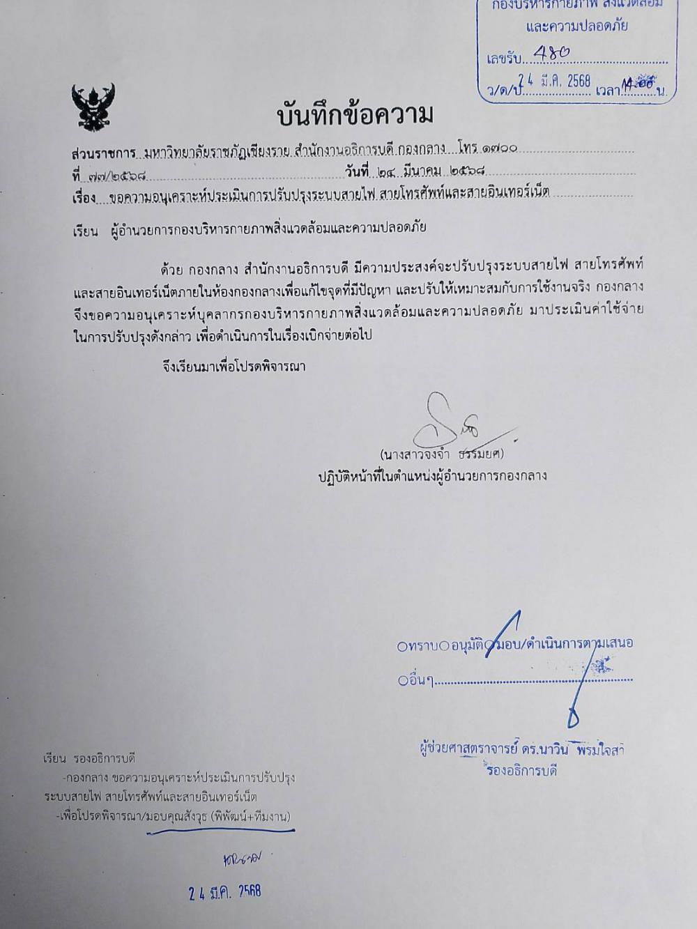 ประเมินค่าใช้จ่ายงานปรับปรุงระบบไฟฟ้า ระบบโทรศัพท์และอินเตอร์เน็ต ภายในห้องกองกลาง สำนักงานอธิการบดี