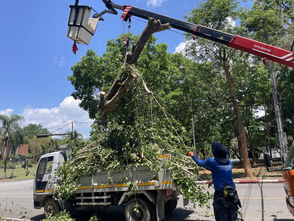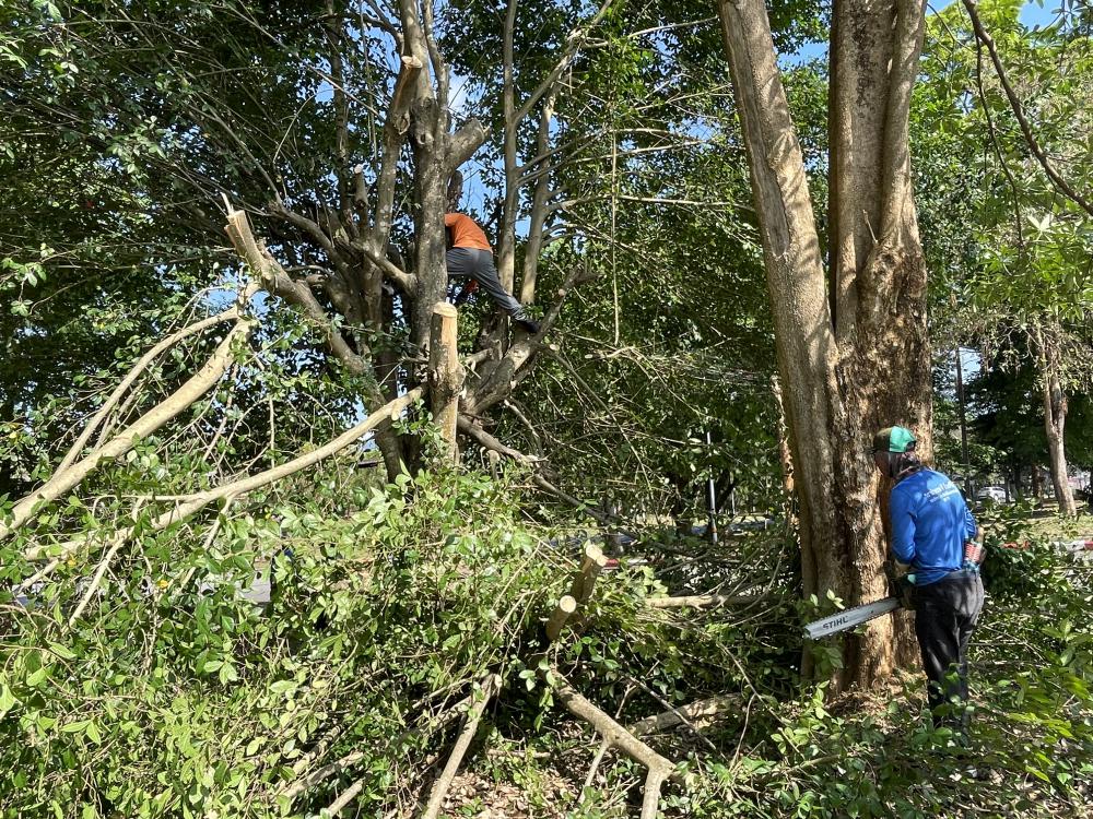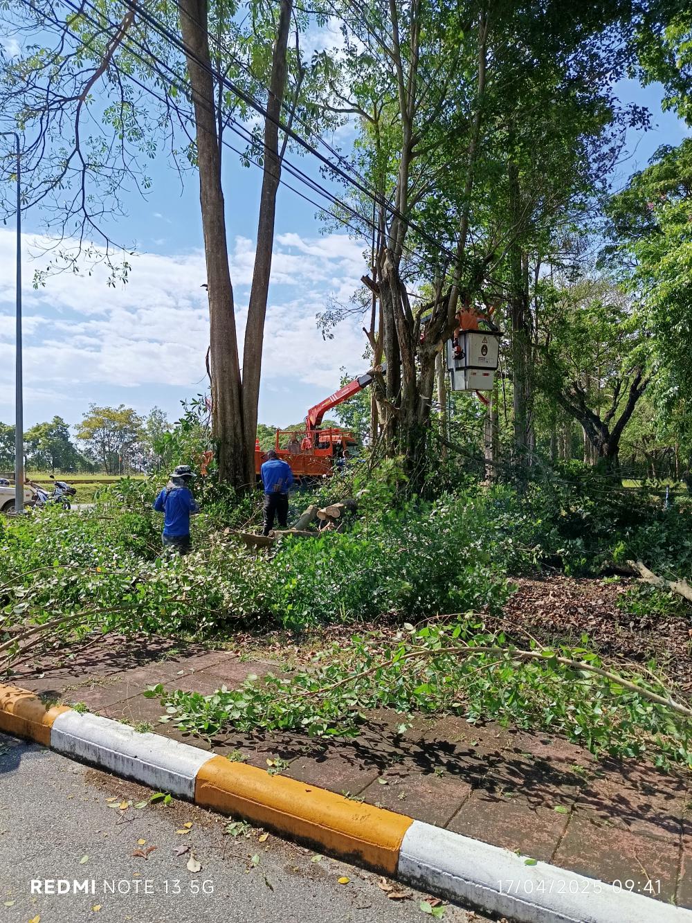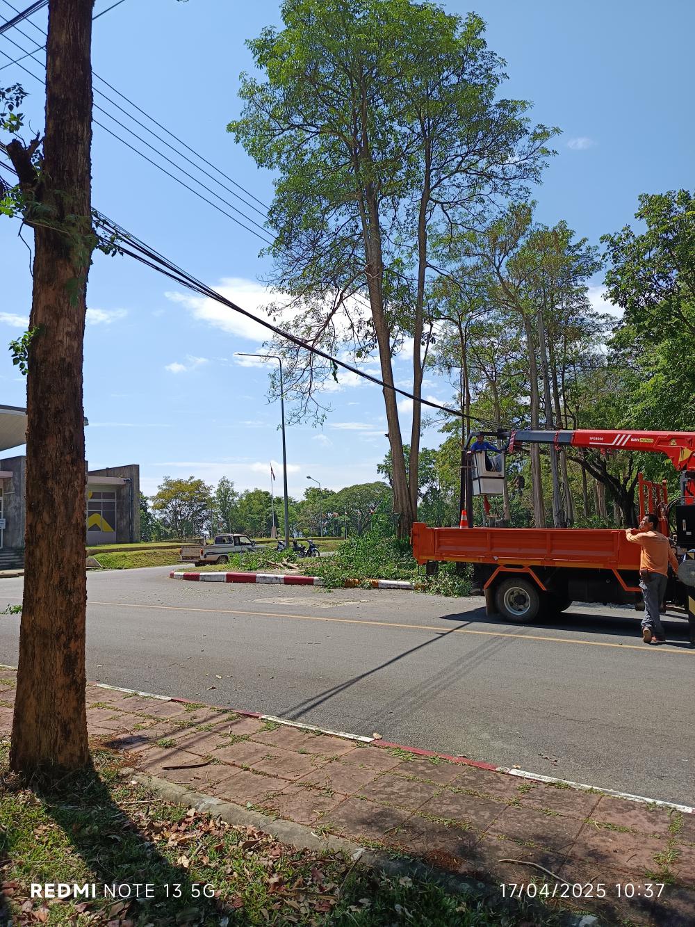 กองบริหารกายภาพฯ ตัดกิ่งไม้แนวสายไฟข้างอาคารบริหารงานกลางและเก็บ