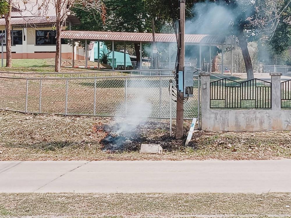 กองพัฒนานักศึกษา ศูนย์สุขภาพแจ้งมีไฟไหม้บริเวณเสาไฟฟ้าด้านหน้าอาคาร มีเพลิงลุกไหม้ที่มิเตอร์ตรงเสาไฟฟ้า