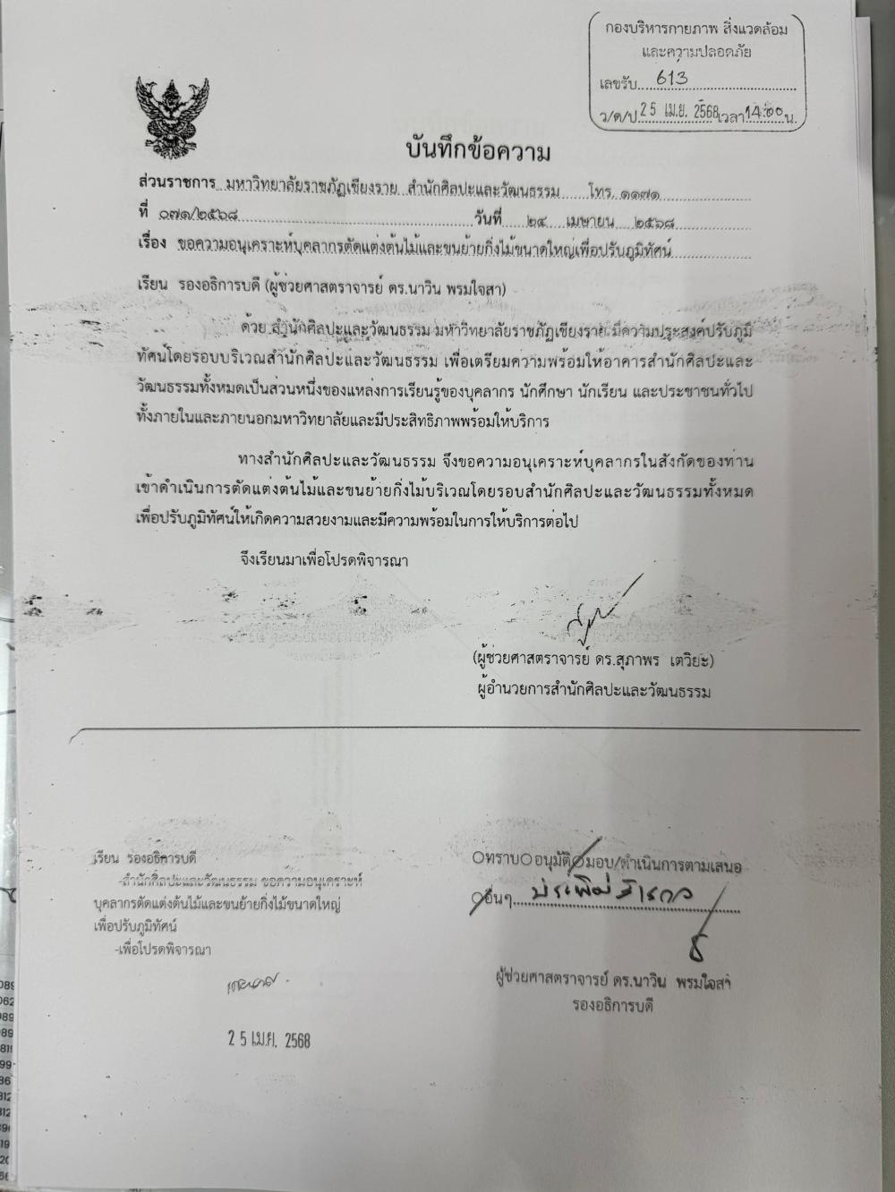 ตัดแต่งกิ่งไม้และขนย้ายกิ่งไม้ขนาดใหญ่ บริเวณอาคารสำนักศิลปะและวัฒนธรรม