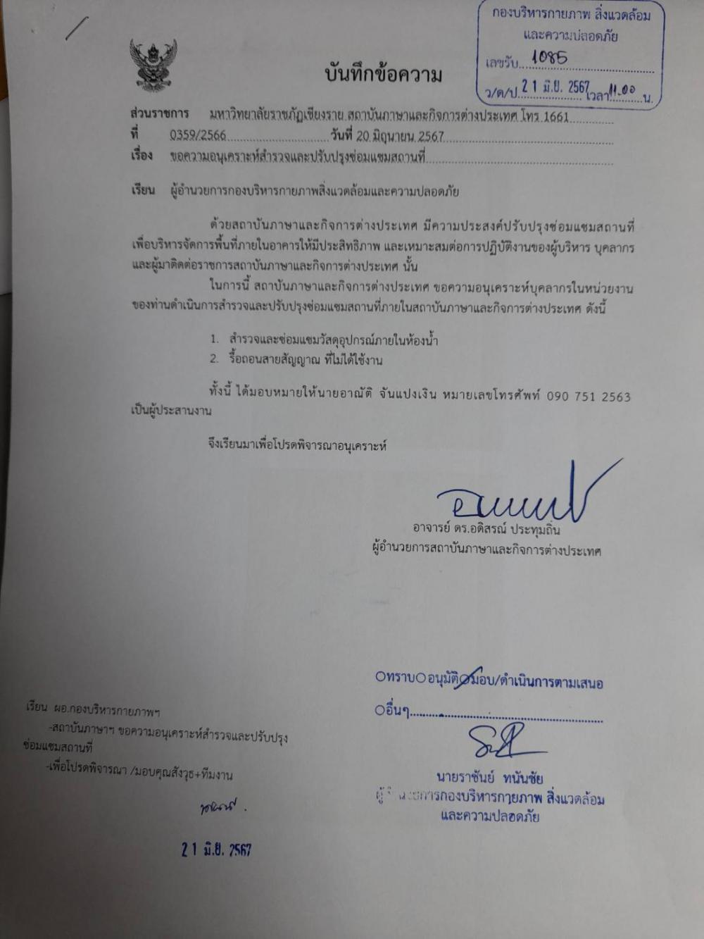 สถาบันภาษาฯ ขออนุเคราะห์สำรวจและซ่อมแซมวัสดุอุปกรณ์ภายในห้องน้ำ และ รื้อถอนสายสัญญาณที่ไม่ได้ใช้งาน ภายในอาคารสถาบันภาษาฯ