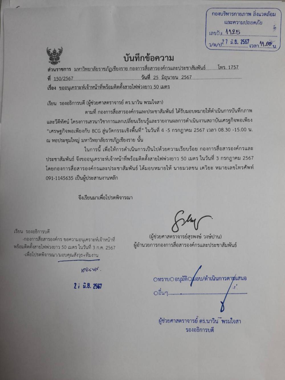 กองการสื่อสารฯ ขออนุเคราะห์เจ้าหน้าที่พร้อมติดตั้งสายไฟพ่วงยาว 50 เมตร ในวันที่ 3 กรกฎาคม 2567 ณ หอประชุมใหญ่