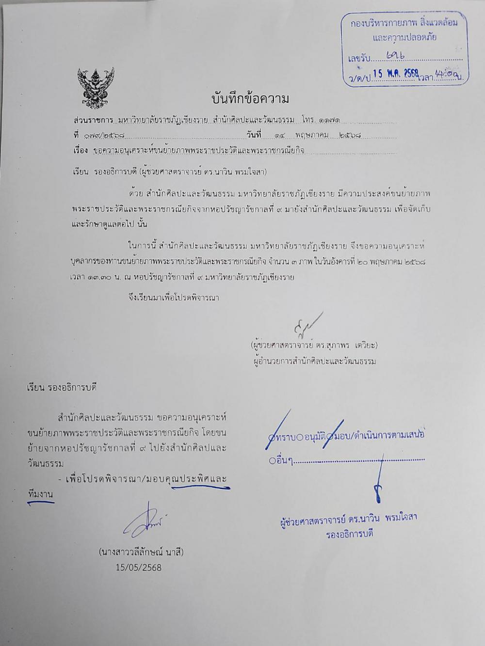 สำนักศิลปะฯ ขนย้ายภาพพระราชประวัติและพระราชกรณียกิจ จากหอปรัชญา ร.9 มายัง สำนักศิลปะและวัฒนธรรม จำนวน 3 ภาพ ในวันอังคารที่ 20 พฤษภาคม 2568 เวลา 13.30 น.