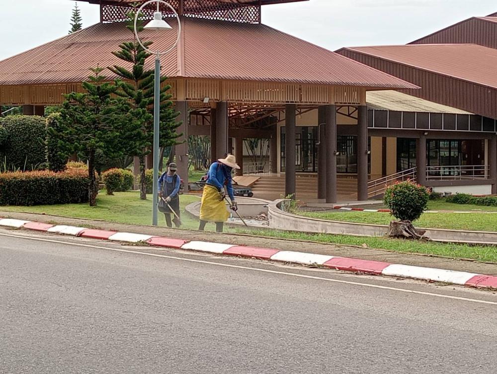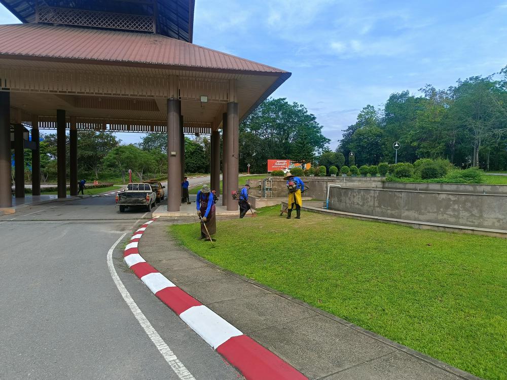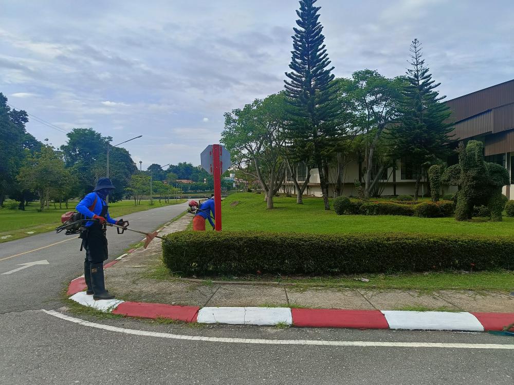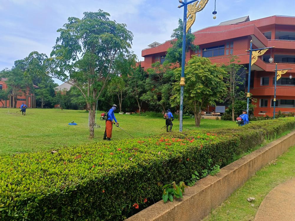 กองบริหารกายภาพฯ ตัดหญ้าอาคารยุพราชตึก 8 ชั้นหน้าตึกไอที