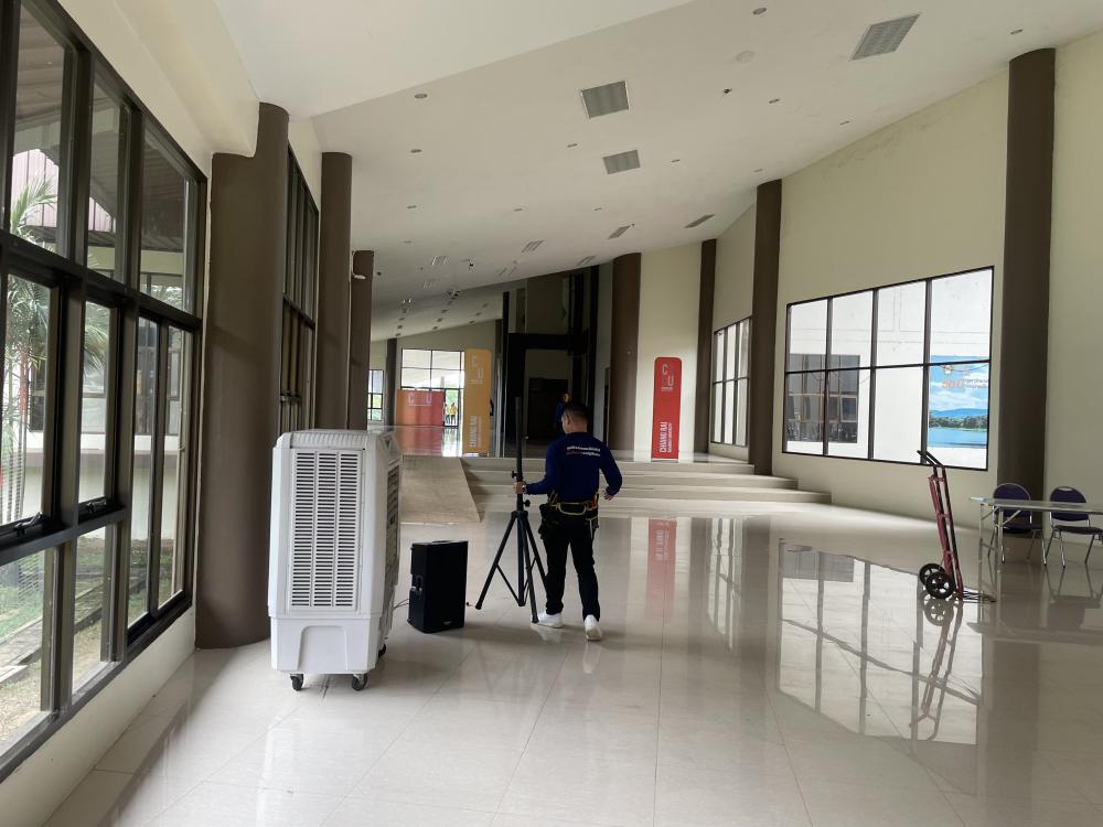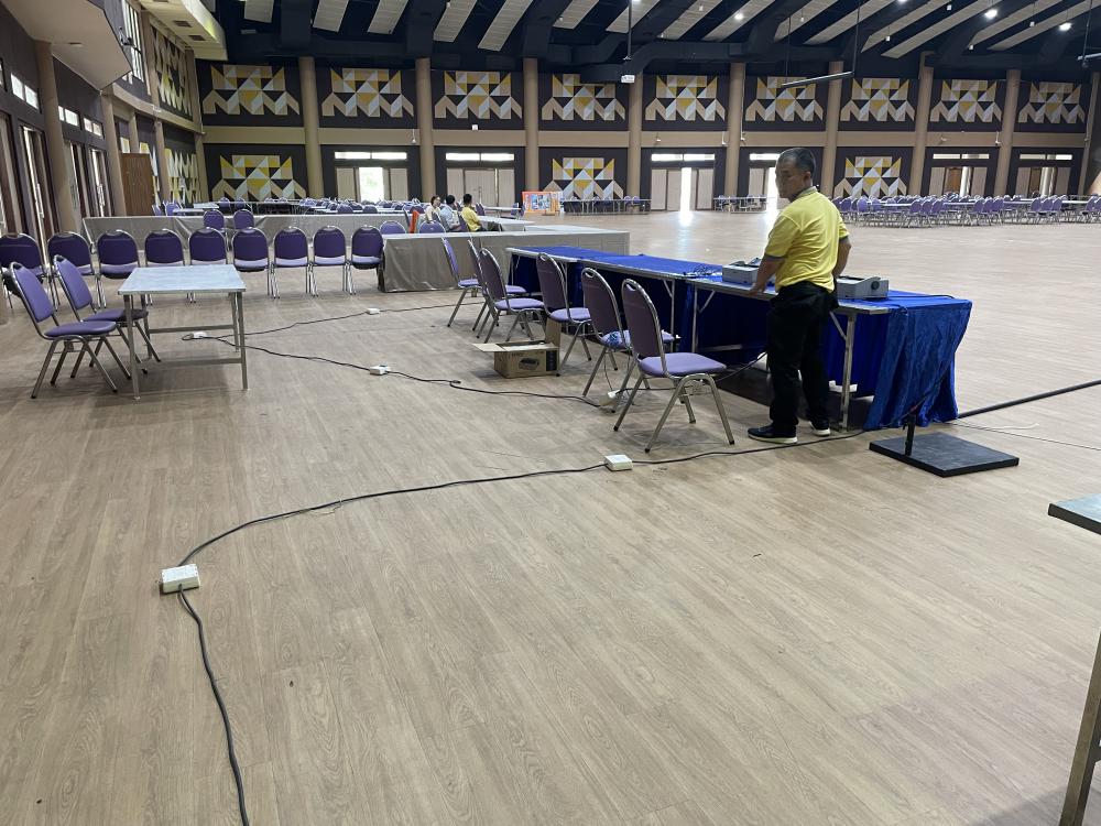 กองการสื่อสารฯ ติดตั้งเครื่องเสียงประชาสัมพันธ์และปลั๊กไฟจุดลงทะเบียนงานรับรายงานตัวนักศึกษา ณ หอประชุมใหญ่