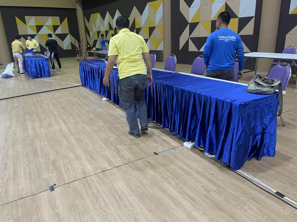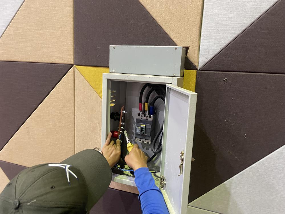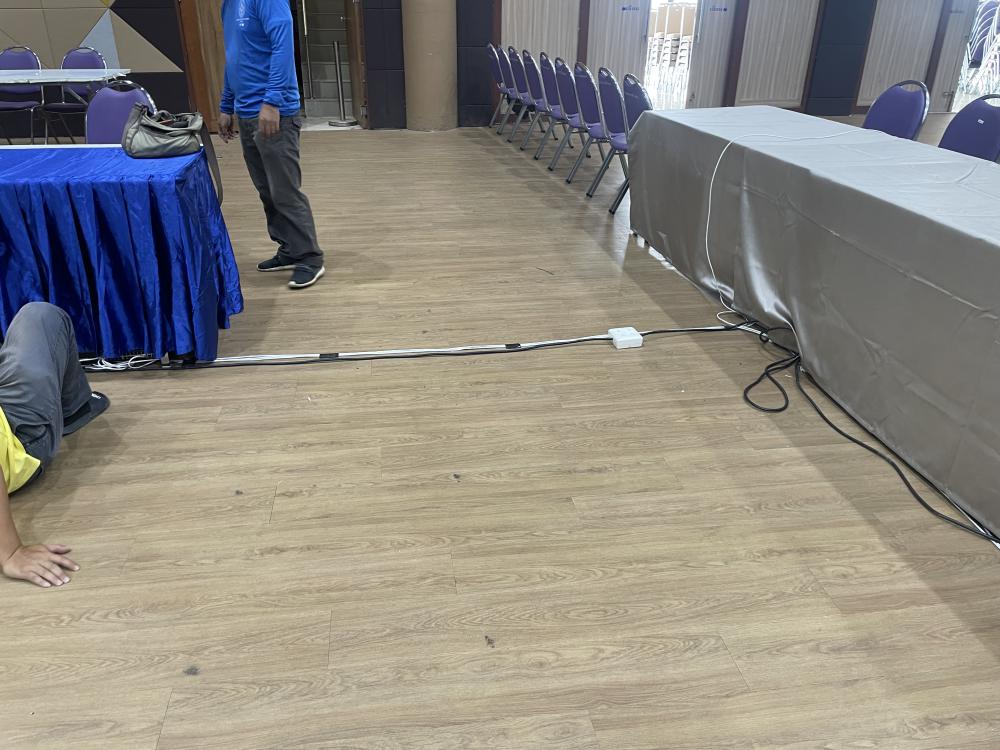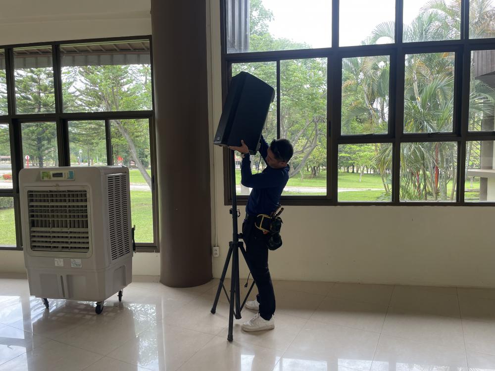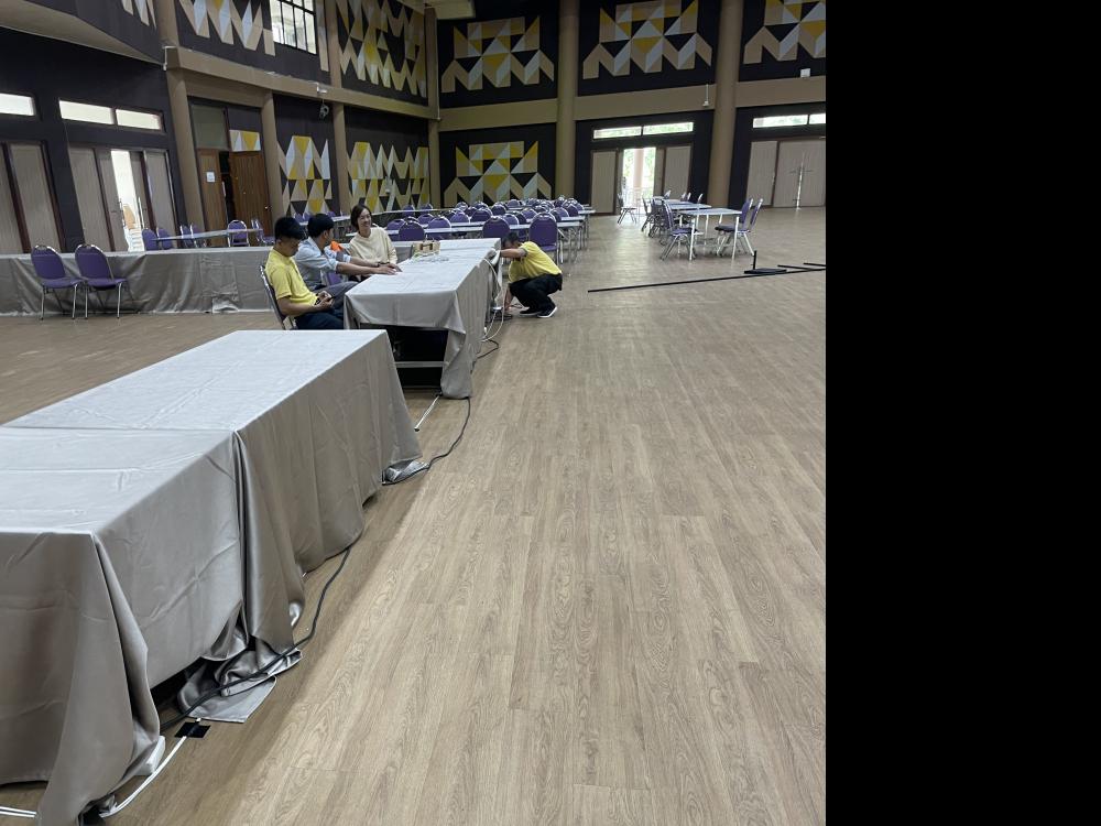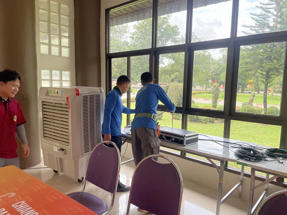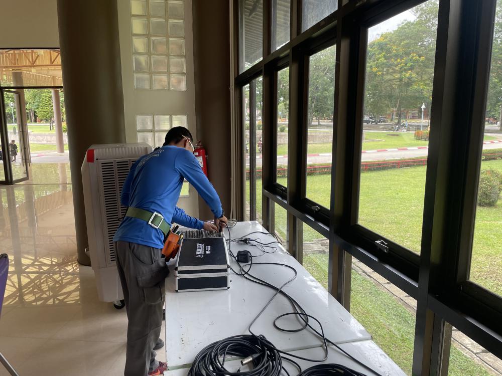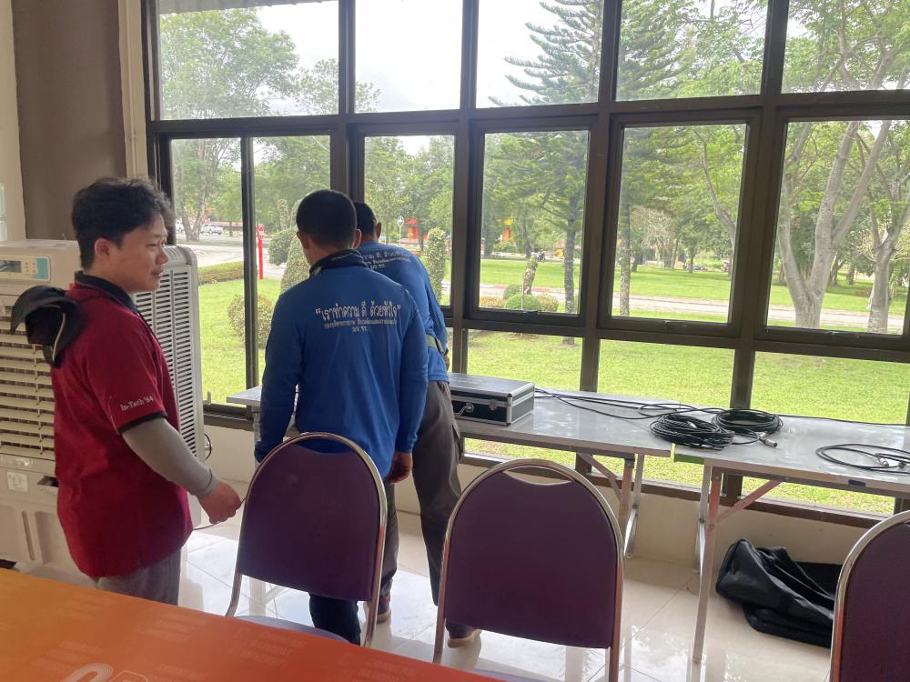 ติดตั้งเครื่องเสียงประชาสัมพันธ์และปลั๊กไฟจุดลงทะเบียนงานรับรายงานตัวนักศึกษา ณ หอประชุมใหญ่