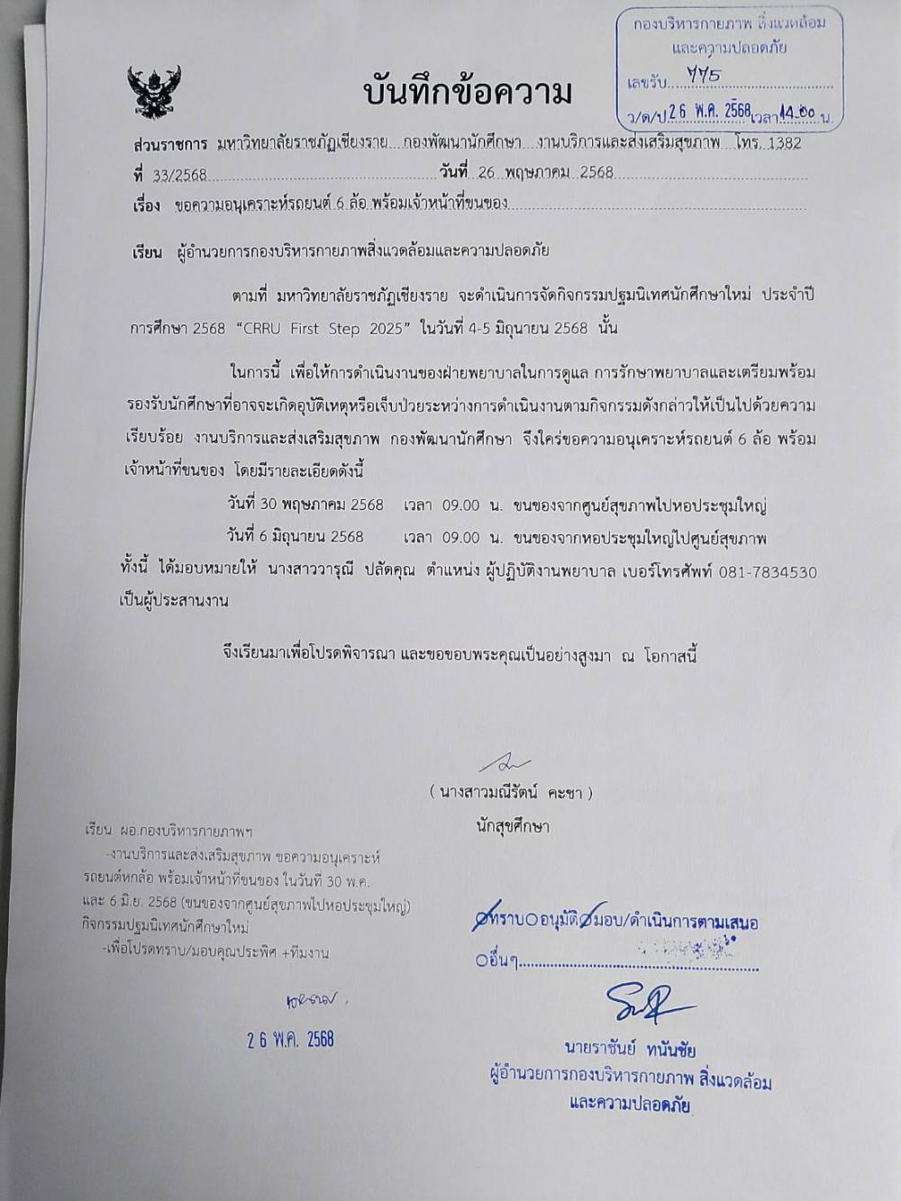 กองพัฒนานักศึกษา ขนอุปกรณ์ฝ่ายพยาบาล จากหอประชุมใหญ่ ไป ศูนย์สุขภาพ วันที่ 6 มิ.ย. 2568 กิจกรรมปฐมนิเทศนักศึกษาใหม่ ประจำปี 2568