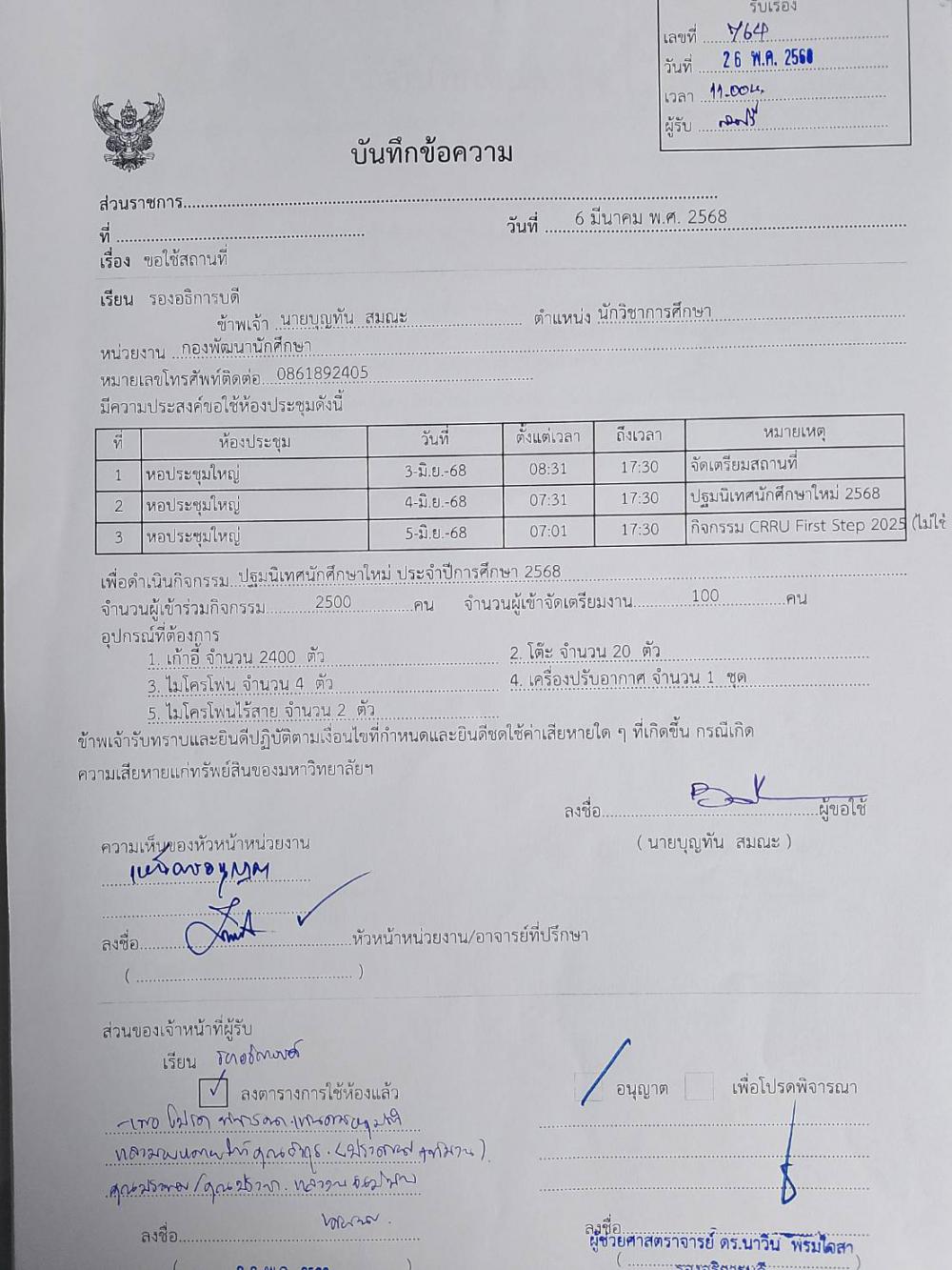 กองพัฒนานักศึกษา จัดสถานที่หอประชุมใหญ่ วันที่ 3 มิ.ย. 2568 ปฐมนิเทศ นศ 68 และ กิจกรรม CRRU FIRST STEP