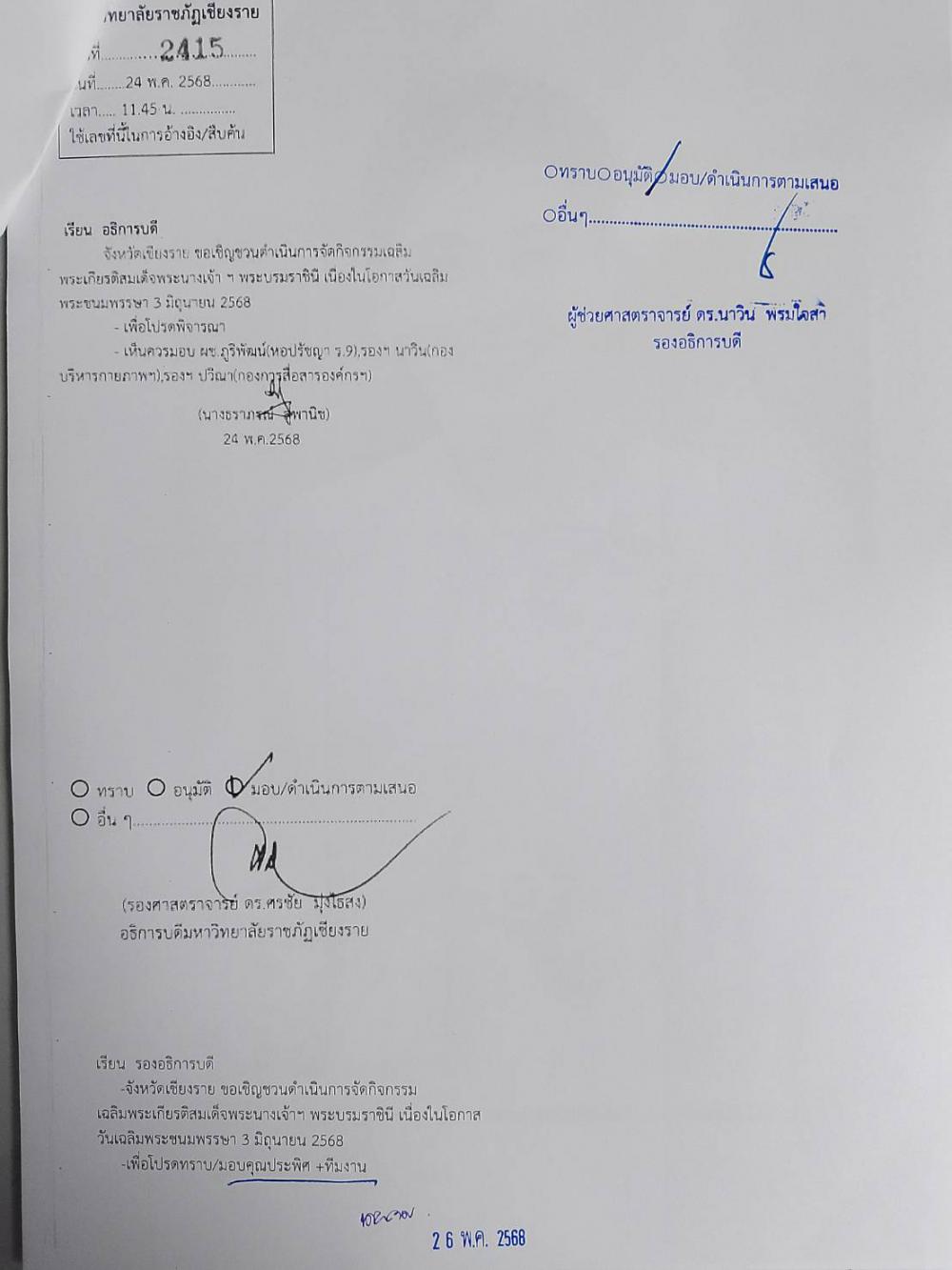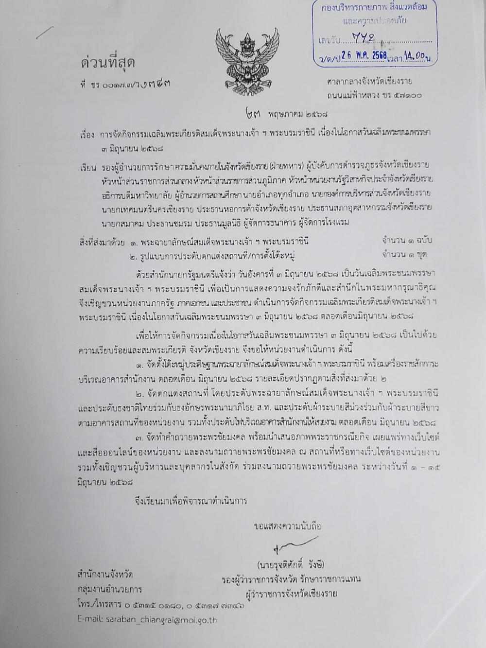 ภายนอกมหาวิทยาลัย จัดสถานที่กิจกรรมเฉลิมพระเกียรติสมเด็จพระนางเจ้าฯ พระบรมราชินี เนื่องในโอกาสวันเฉลิมพระชนมพรรษา วันที่ 3 มิ.ย. 68 บริเวณสำนักงานอธิการบดี