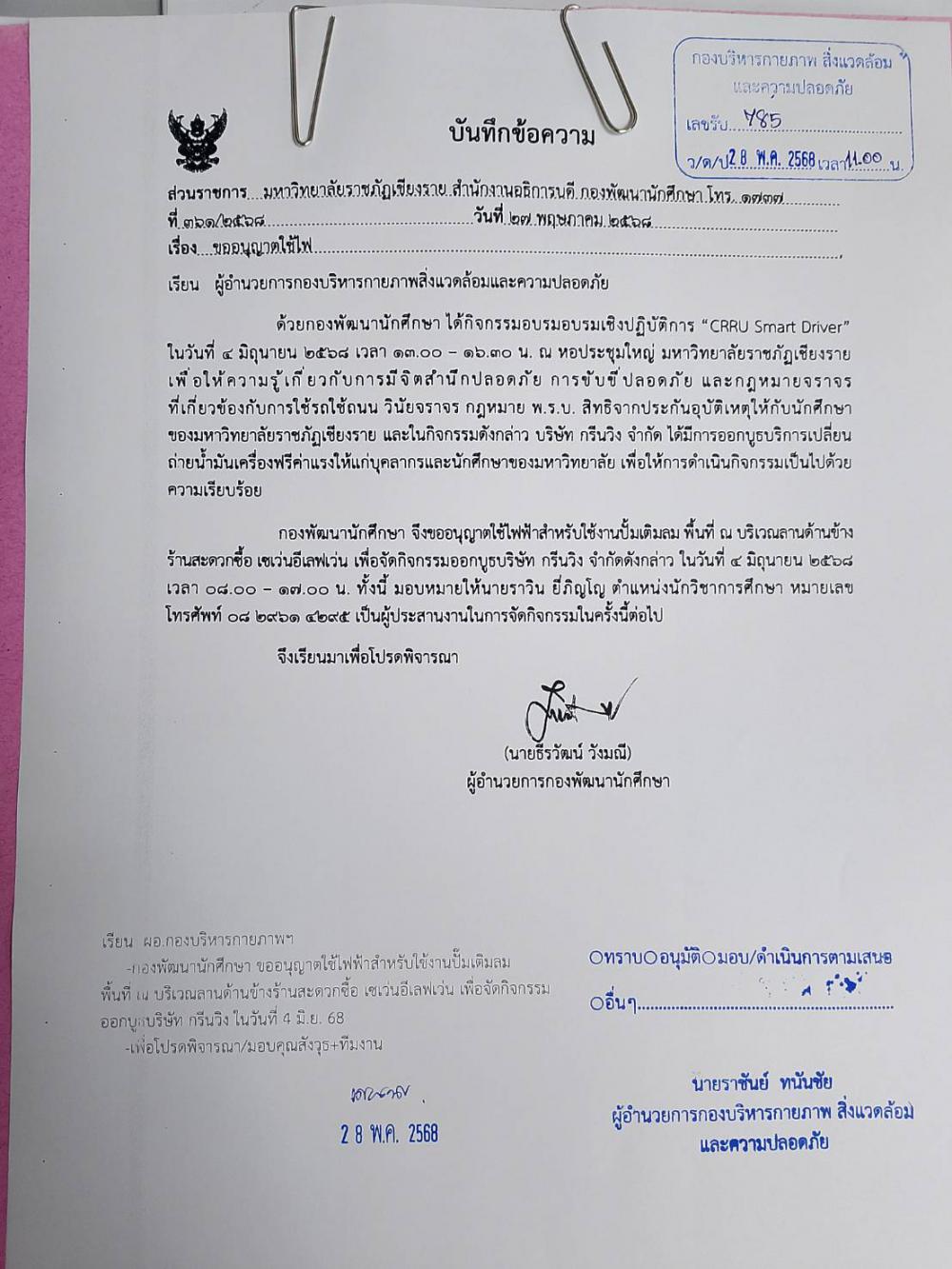 กองพัฒนานักศึกษา บริการจุดเชื่อมต่อไฟฟ้าสำหรับใช้งานปั๊มเติมลม บริเวณลานด้านข้างร้านสะดวกซื้อ 7-11 วันที่ 4 มิ.ย. 2568 ในกิจกรรมออกบูธ บริษัท กรีนวิง จำกัด