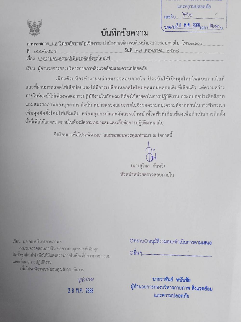ตรวจสอบและติดตั้งชุดโคมไฟแบบดาวน์ไลท์เพิ่มเติม ภายในห้องสำนักงานหน่วยตรวจสอบภายใน