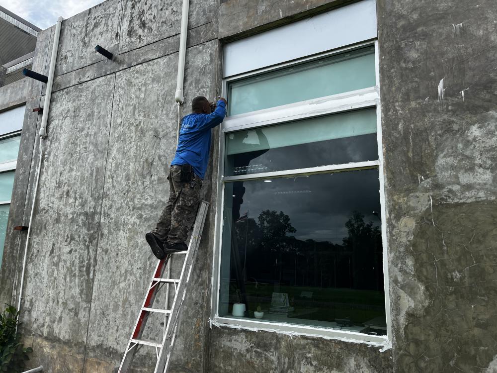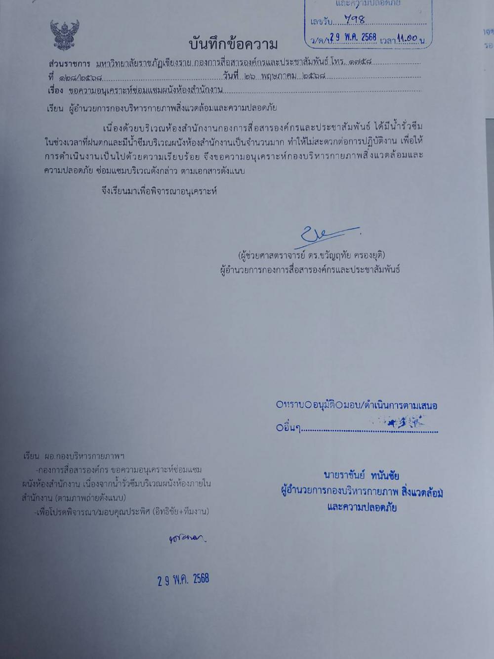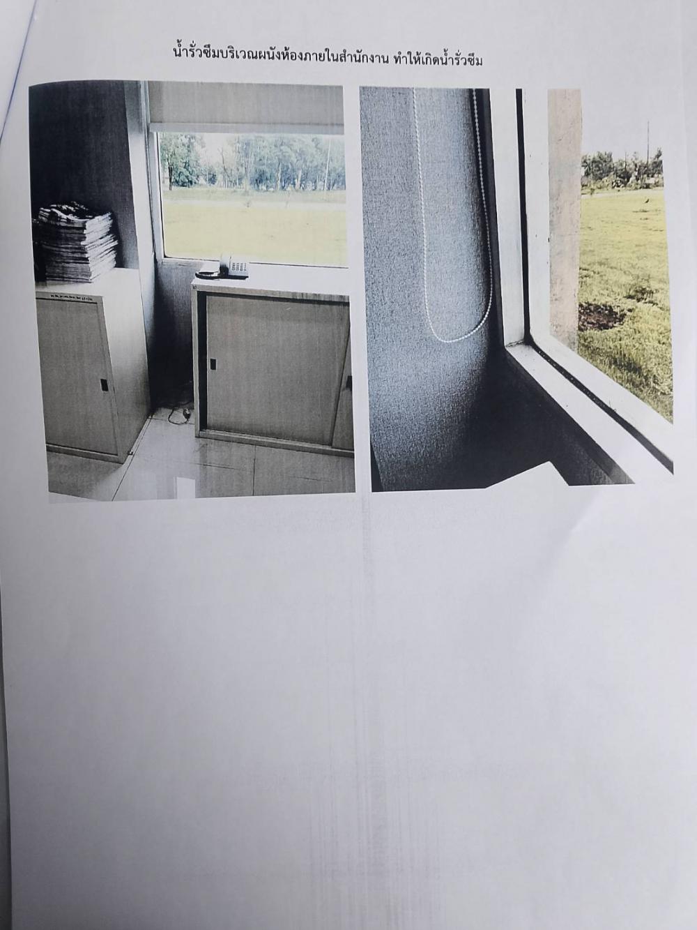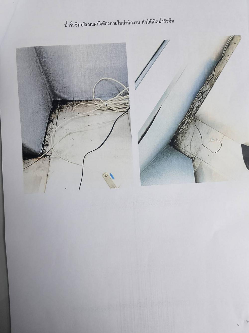 กองการสื่อสารฯ ตรวจสอบและซ่อมแซมผนังห้องสำนักงานกองการสื่อสารองค์กรฯ จากน้ำรั่วซึมในช่วงเวลาที่ฝนตก
