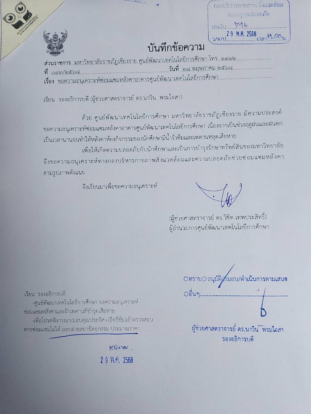 ศูนย์พัฒนาเทคโนโลยีฯ ตรวจสอบและซ่อมแซมหลังคาอาคารศูนย์พัฒนาเทคโนโลยีการศึกษา หากตรวจสอบแล้วไม่สามารถดำเนินการได้ ให้แจ้งฝ่ายสถาปัตยกรรมฯ ทำประมาณราคา