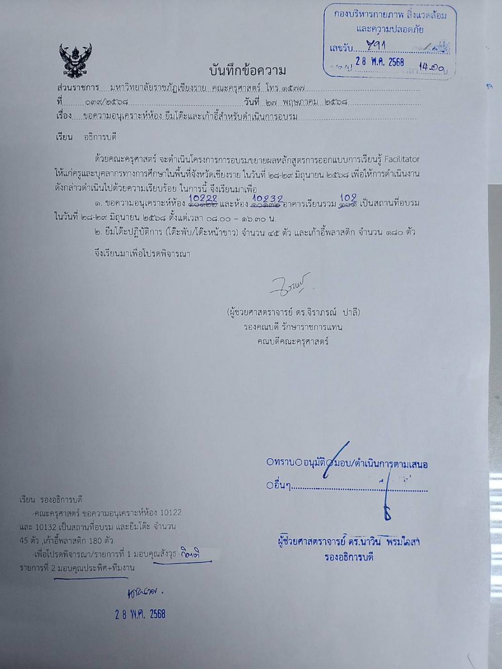 คณะครุศาสตร์ บริการขนย้ายอุปกรณ์ ไปที่อาคารเรียนรวม 102 ห้อง 10222, 10232 ดังนี้ โต๊ะ 45 ตัว เก้าอี้พลาสติก 180 ตัว