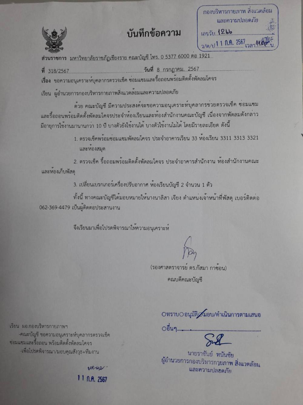 คณะบัญชี ขอความอนุเคราะห์ตรวจเช็ค ซ่อมแซมและรื้อถอนพร้อมติดตั้งพัดลมโคจรประจำห้องเรียนและห้องสำนักงานคณะบัญชี ดังนี้ 1. ตรวจเช็คซ่อมแซมในอาคาร 33 ห้องเรียน 3311, 3313, 3321 และห้องสมุด 2.ตรวจเช็ค รื้อถอนพร้อมติดตั้งในอาคารคณะบัญชี ห้องสำนักงานและห้องเก็บพัสดุ 3.เปลี่ยนเบรกเกอร์เครื่องปรับอากาศ ห้องเรียนบัญชี 2 จำนวน 1 ตัว