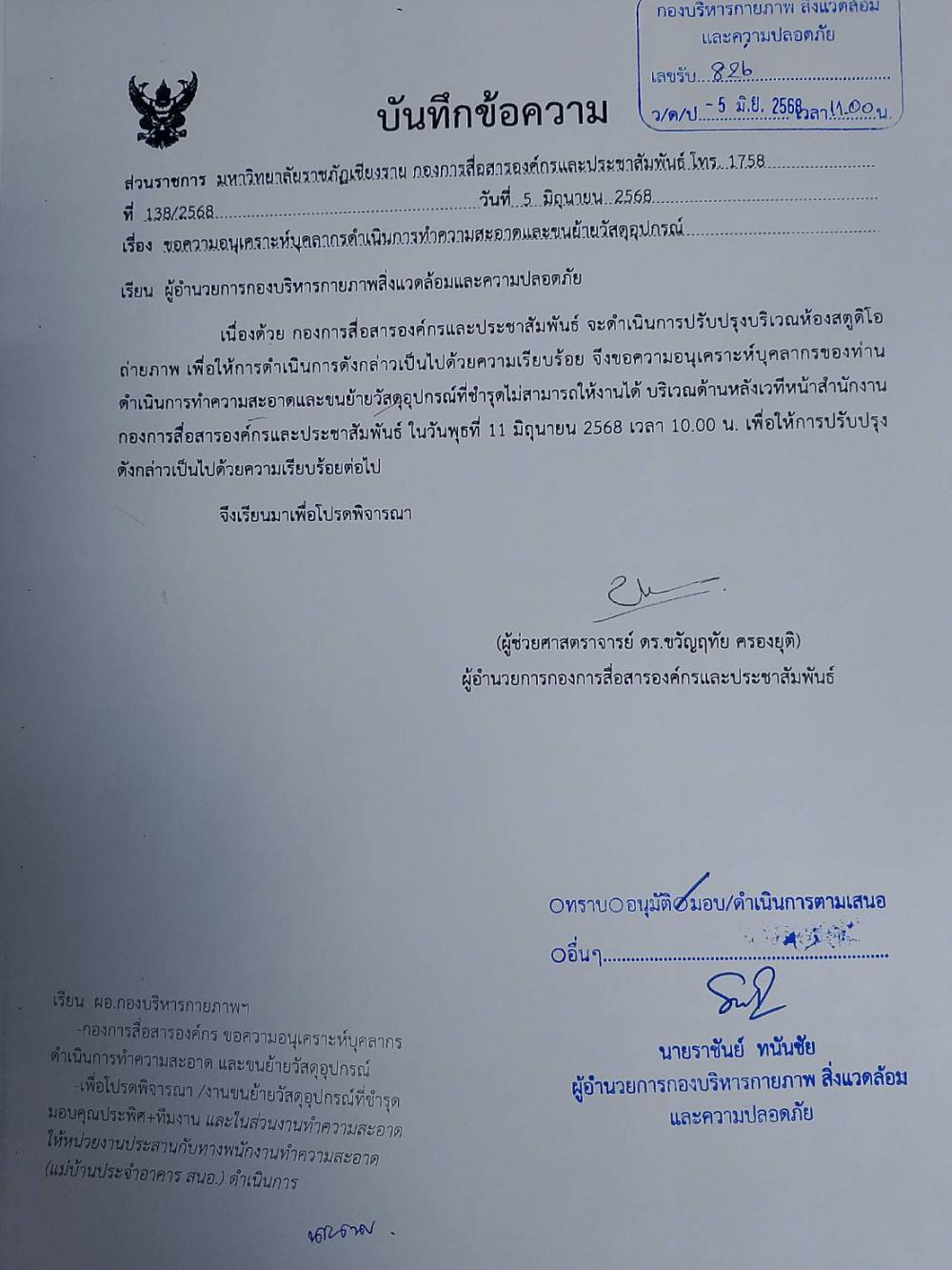 กองการสื่อสารฯ ขนย้ายวัสดุอุปกรณ์ที่ชำรุดไม่สามารถใช้งานได้ บริเวณห้องสตูดิโอถ่ายภาพ ขอให้ดำเนินการในวันที่ 11 มิ.ย. 2568