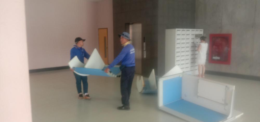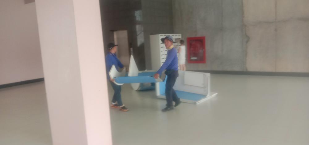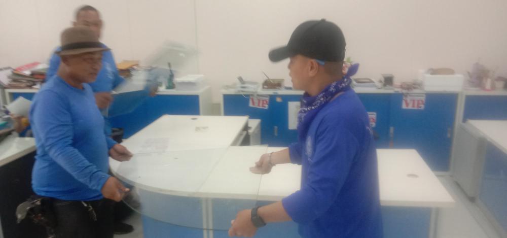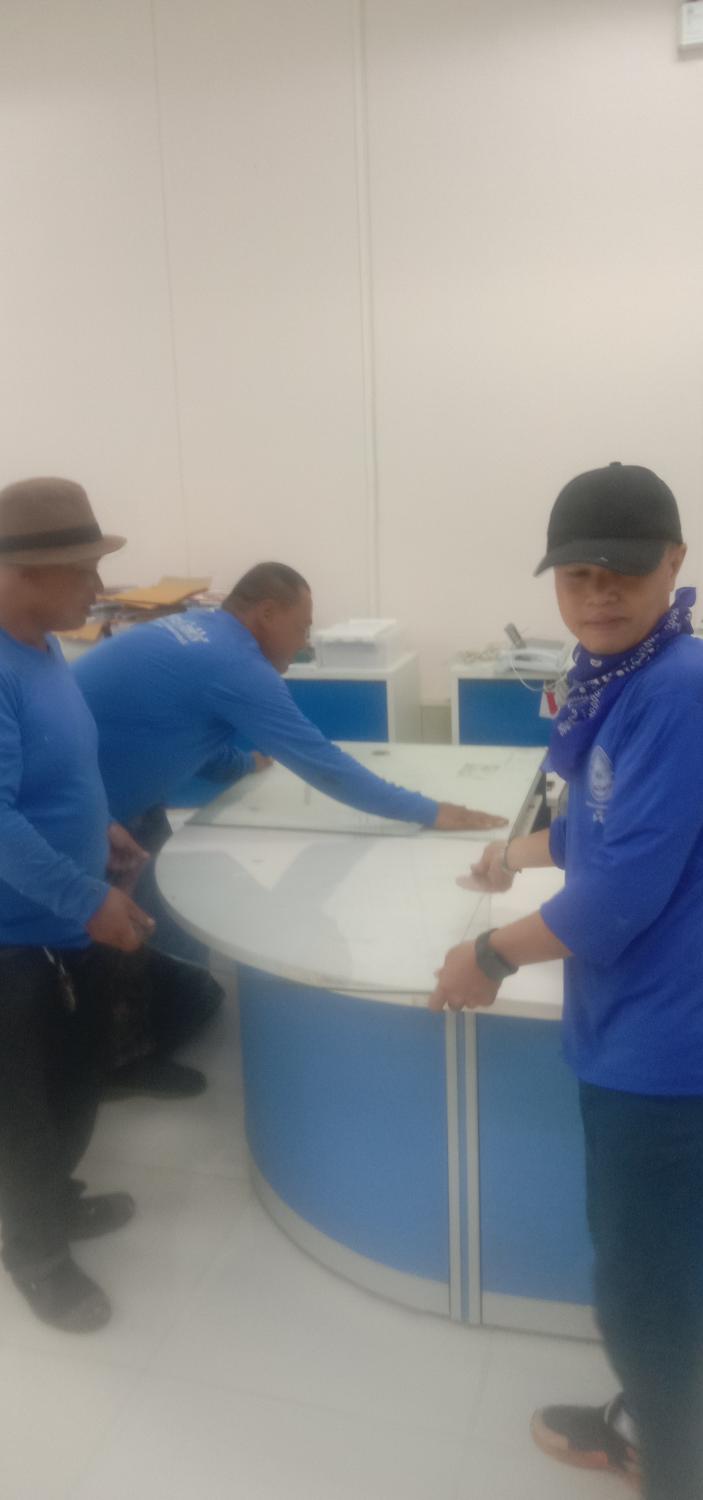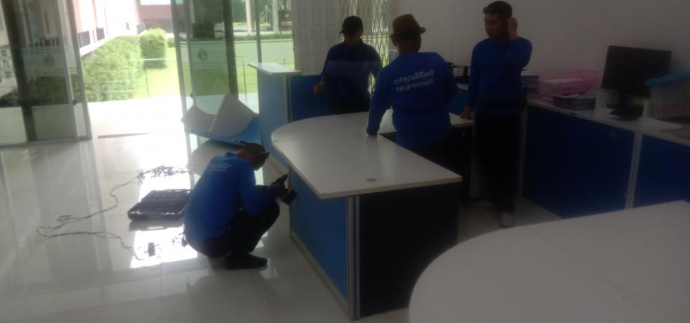 กองบริหารกายภาพฯ รื้อชุดโต๊ะ เคาน์เตอร์ ห้องกองกลาง เพื่อขนย้ายส่งคืนพัสดุ ใต้ตึกอธิการบดี